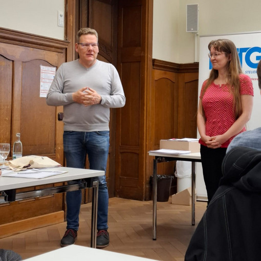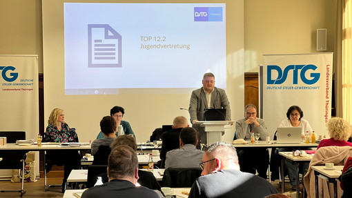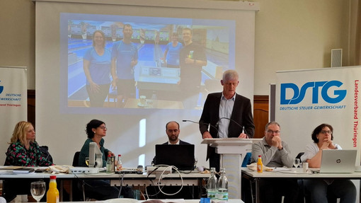 Zunächst richtete Herr Hendrik Hintze, Leiter des Fachbereichs Steuern, ein Grußwort an die Teilnehmenden und berichtete über den Tag der offenen Tür im BZ Gotha, an dem auch die DSTG Thüringen teilnahm. Anschließend folgte ein Beitrag von René Plathe (BB-Bank), der auf viele interessante Fachvorträge verwies.